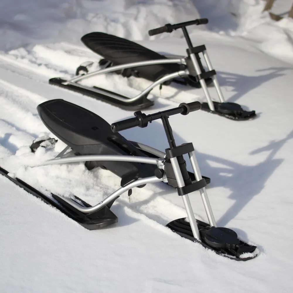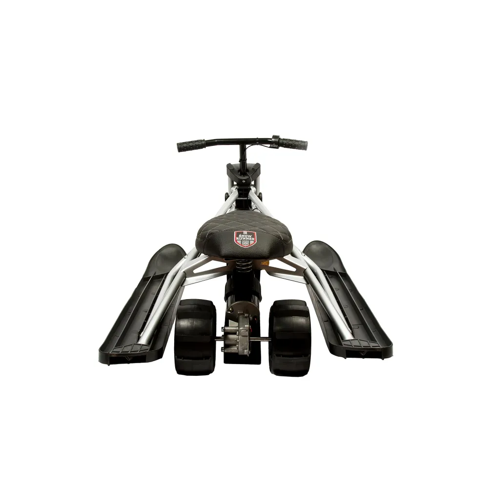 Визуального модный электроснегокат выглядит компактно и эргономично. Общий вес техники сравнительно легкий, составляет 12,7 кг. Конструкция рамы – долговечная и надежная, стальная, не деформируется при эксплуатации в жестких условиях. Большое удобное сиденье покрыто экокожей. Мягкое, повторяет анатомические части тела ездока. Лыжи изготовлены из ударопрочного пластика, гарантируют отличный накат.