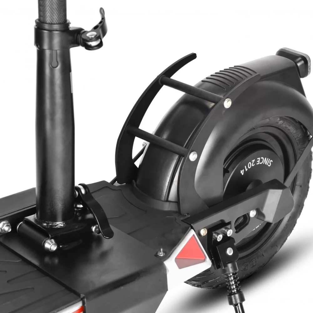 Электродвигатель мощностью 1000 Вт свободно разгоняется до максимальных показателей 45 км/час. Литий-ионный аккумулятор (емкостью 16000 мАч) надежно защищен от механических повреждений. Полного заряда АКБ (8 часов) хватит на прохождение 50 км пути. Амортизационные пружины хорошо смягчают дорожные неровности и дарят полное ощущение комфорта. Складная конструкция и удобное сидение делают его особенно популярным среди райдеров. Резиновые надувные колеса (11 дюймов) рассчитаны на эксплуатацию в городской местности и парковых зонах. Широкая дека 22*47 см позволит пользователю комфортно располагаться при поездках. Дисковая механическая тормозная система предусмотрена отдельно на каждом колесе дарит райдеру полное ощущение безопасности. Для большего удобства поездок на руле расположен переключатель скоростей.